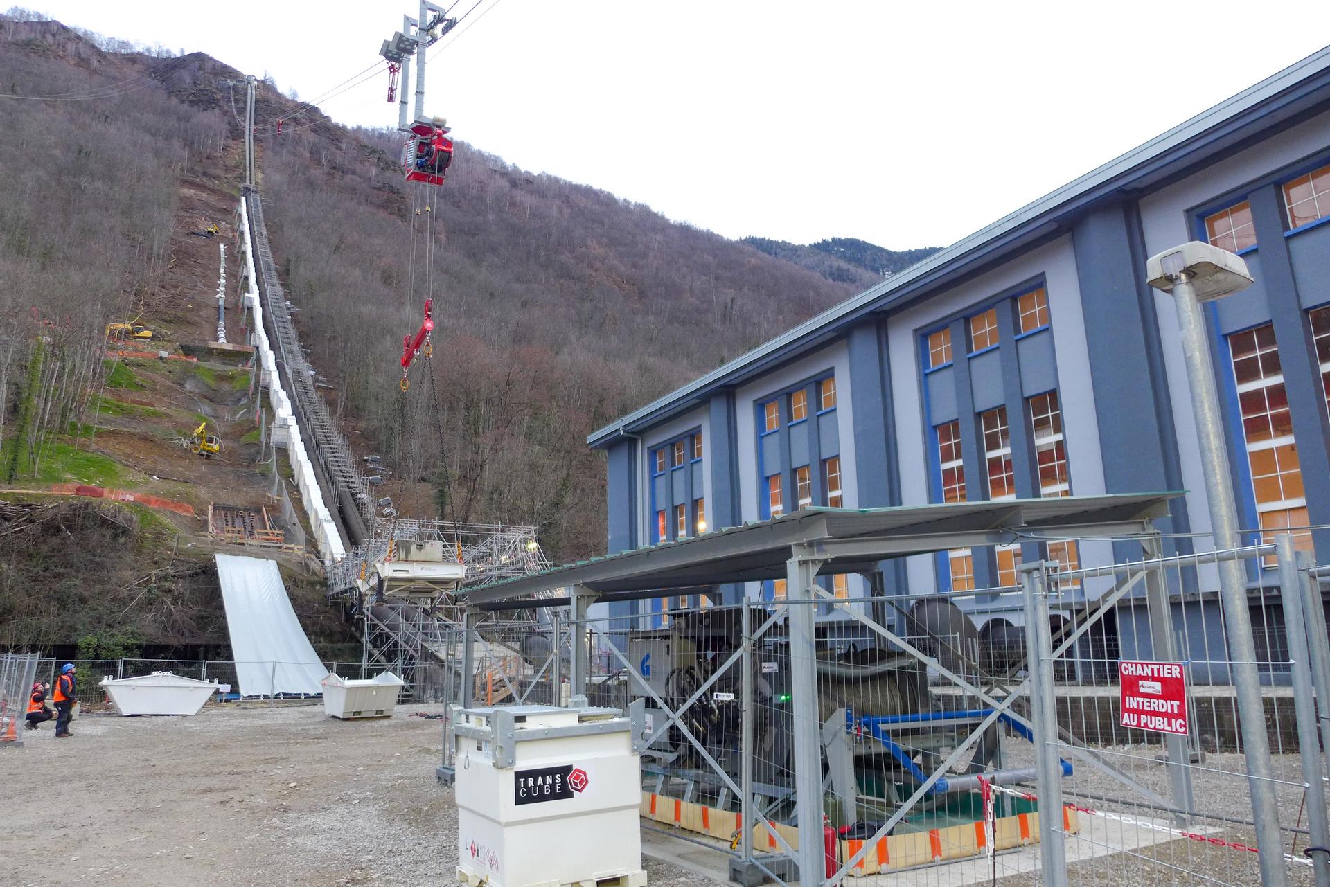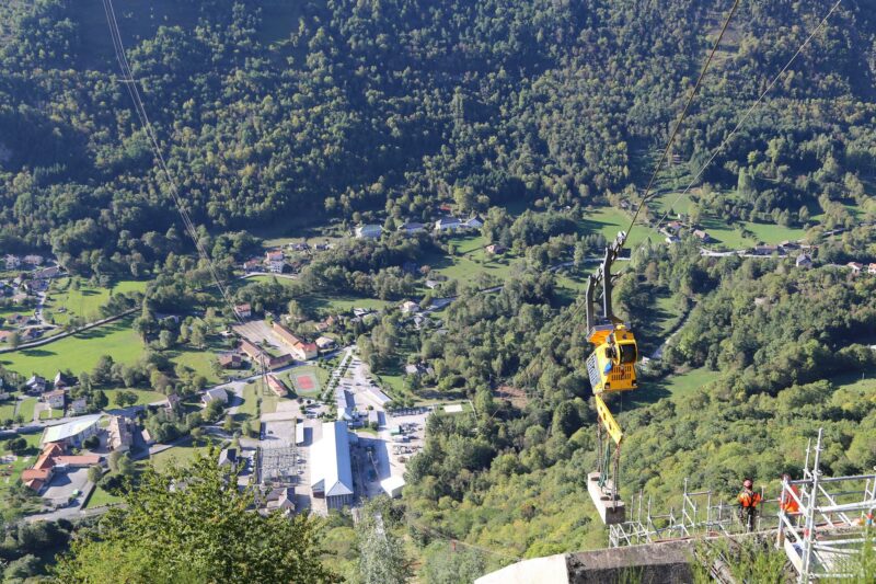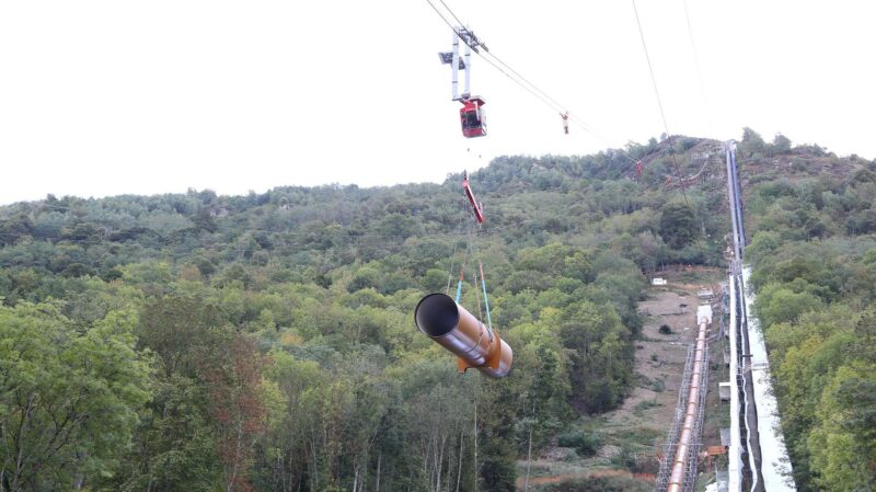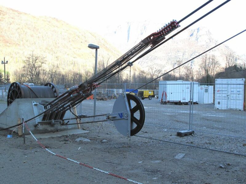 Seilbahnkomponenten im Einsatz bei Bau eines Wasserkraftwerks in Frankreich.