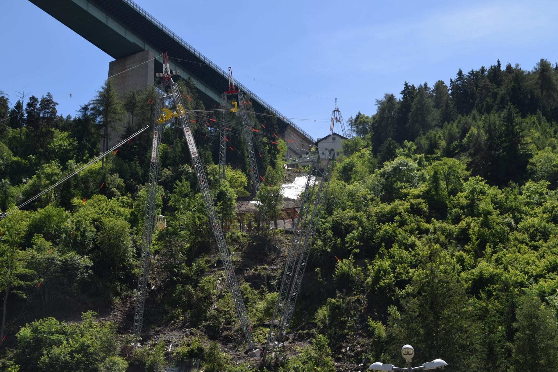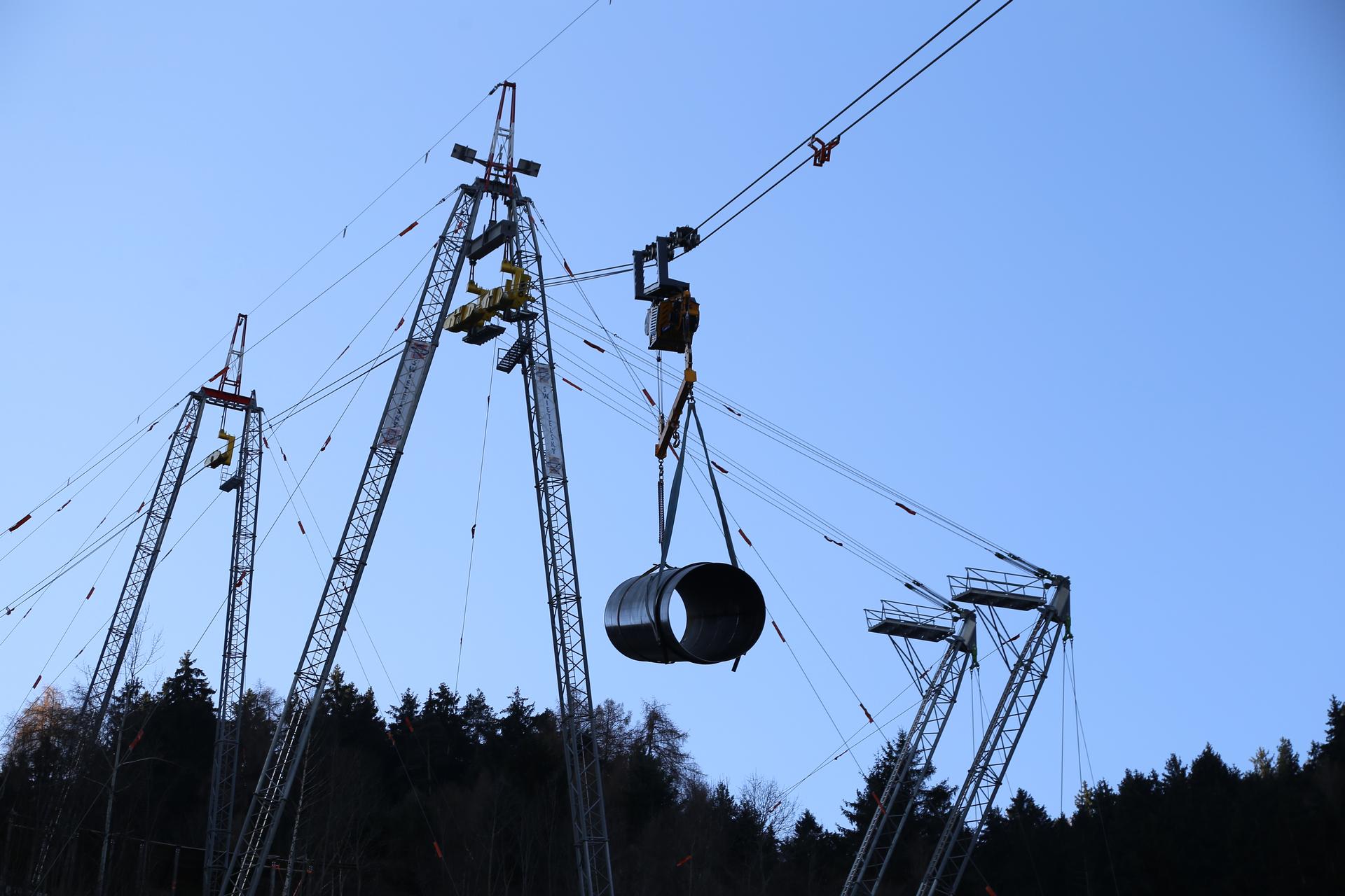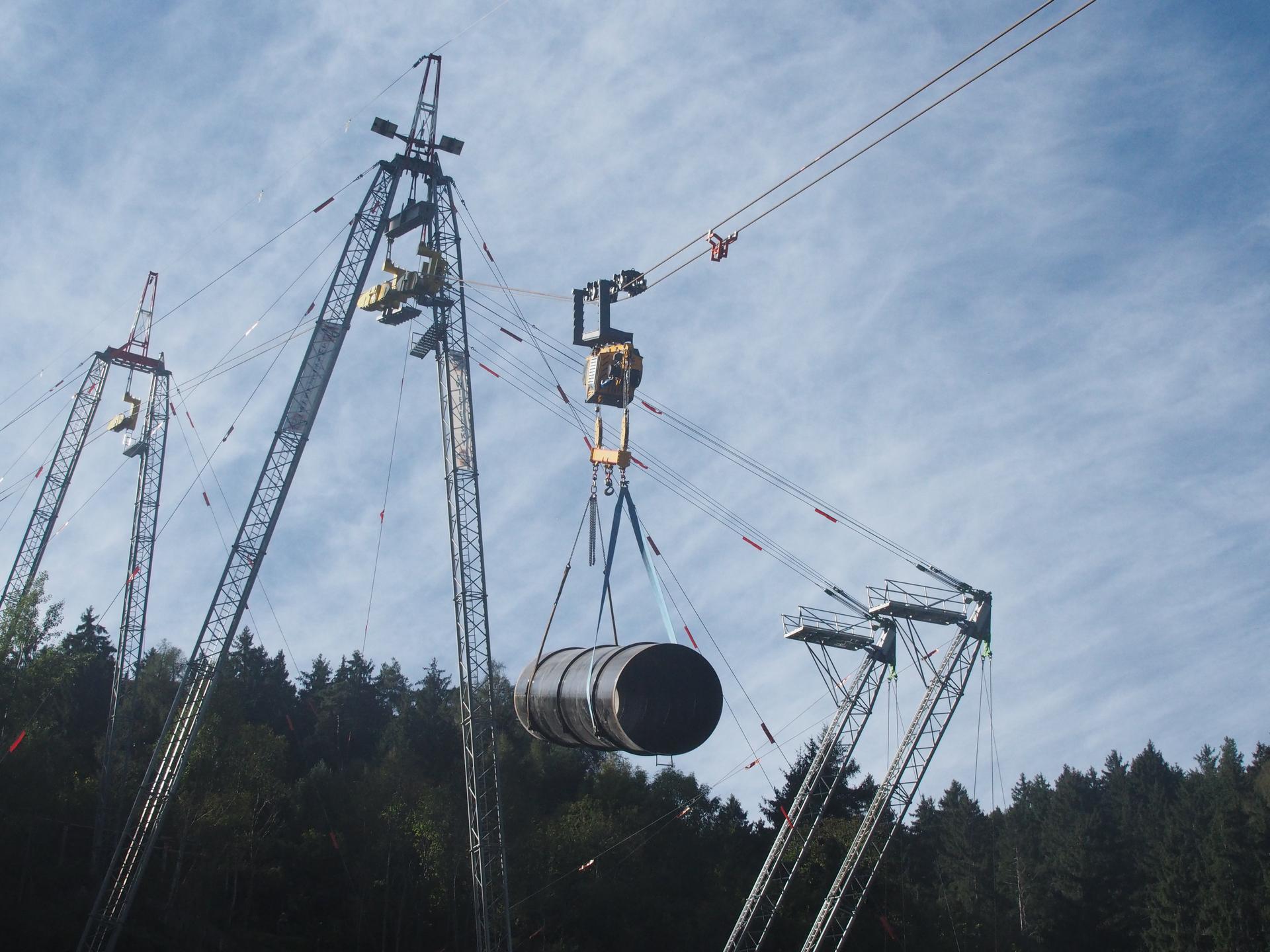 Leistungsstarke Seilkrananlage für den Bau einer Druckrohrleitung neben der Europabrücke.