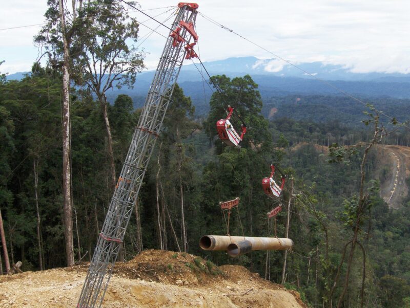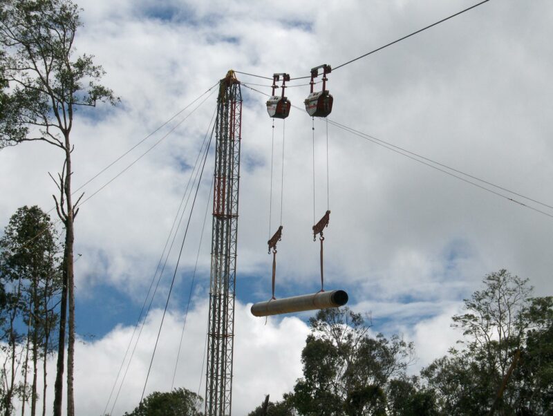 Seilkrananlage im Einsatz bei dem Bau einer Pipeline inmitten des Urwaldes.