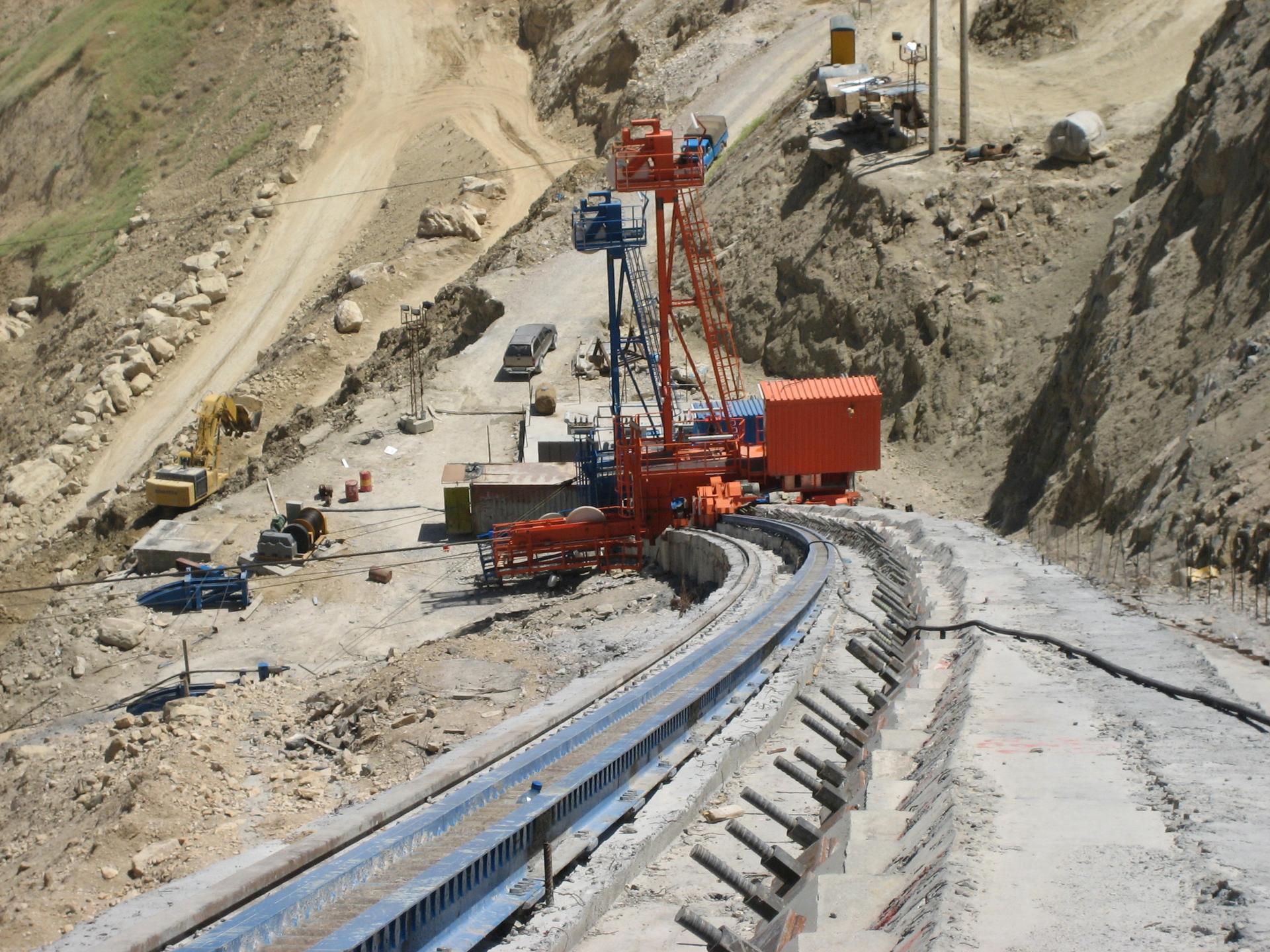 Radialkran mit sphärischer Fahrbahn mit konstanter Neigung für den Bau eines Staudammes realisiert.