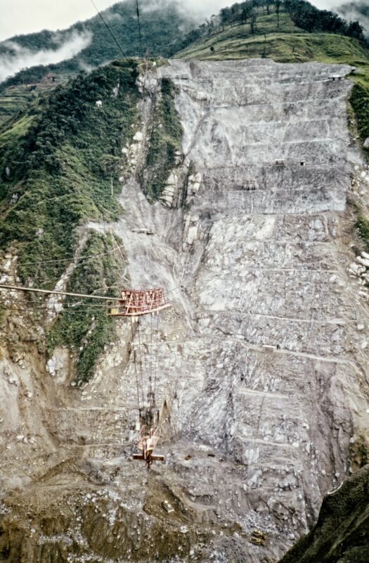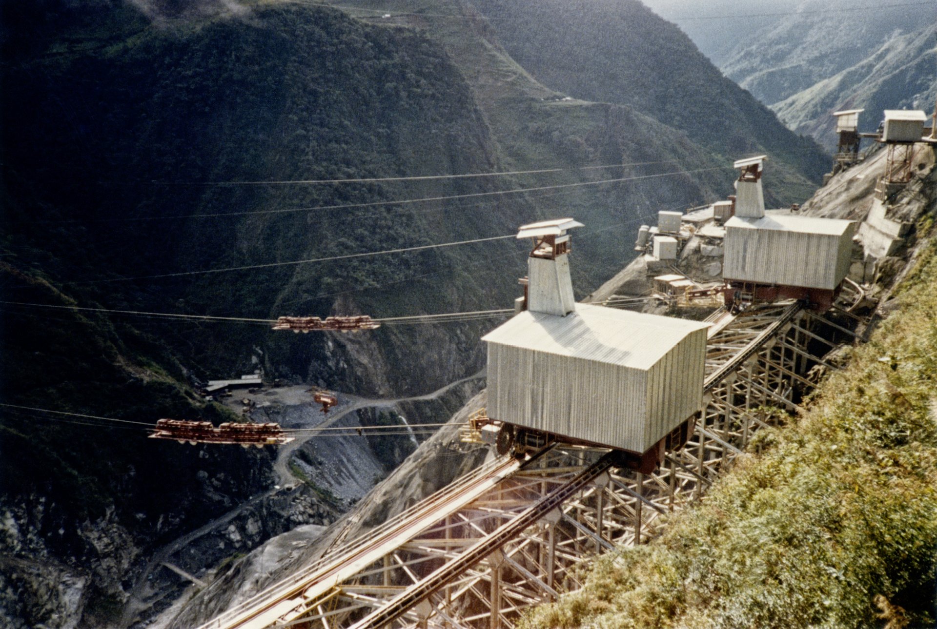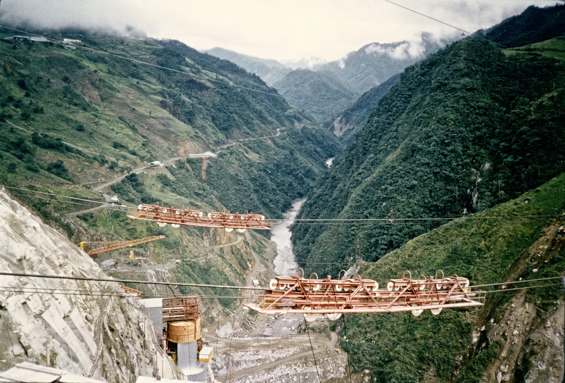 Radialfahrbare Kabelkrane im Einsatz in Ecuader für den Bau des Paute Staudamms.