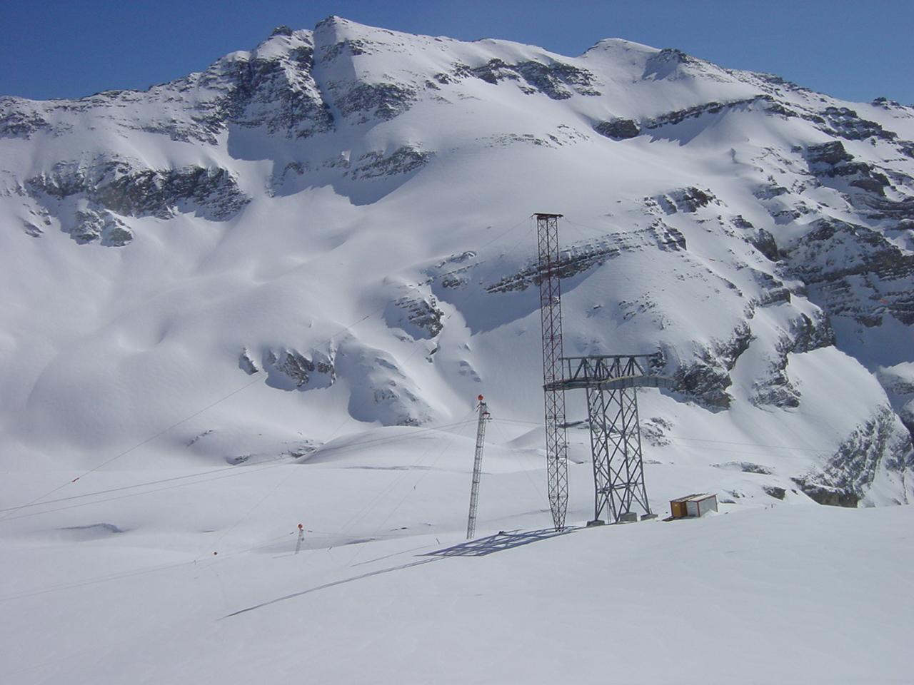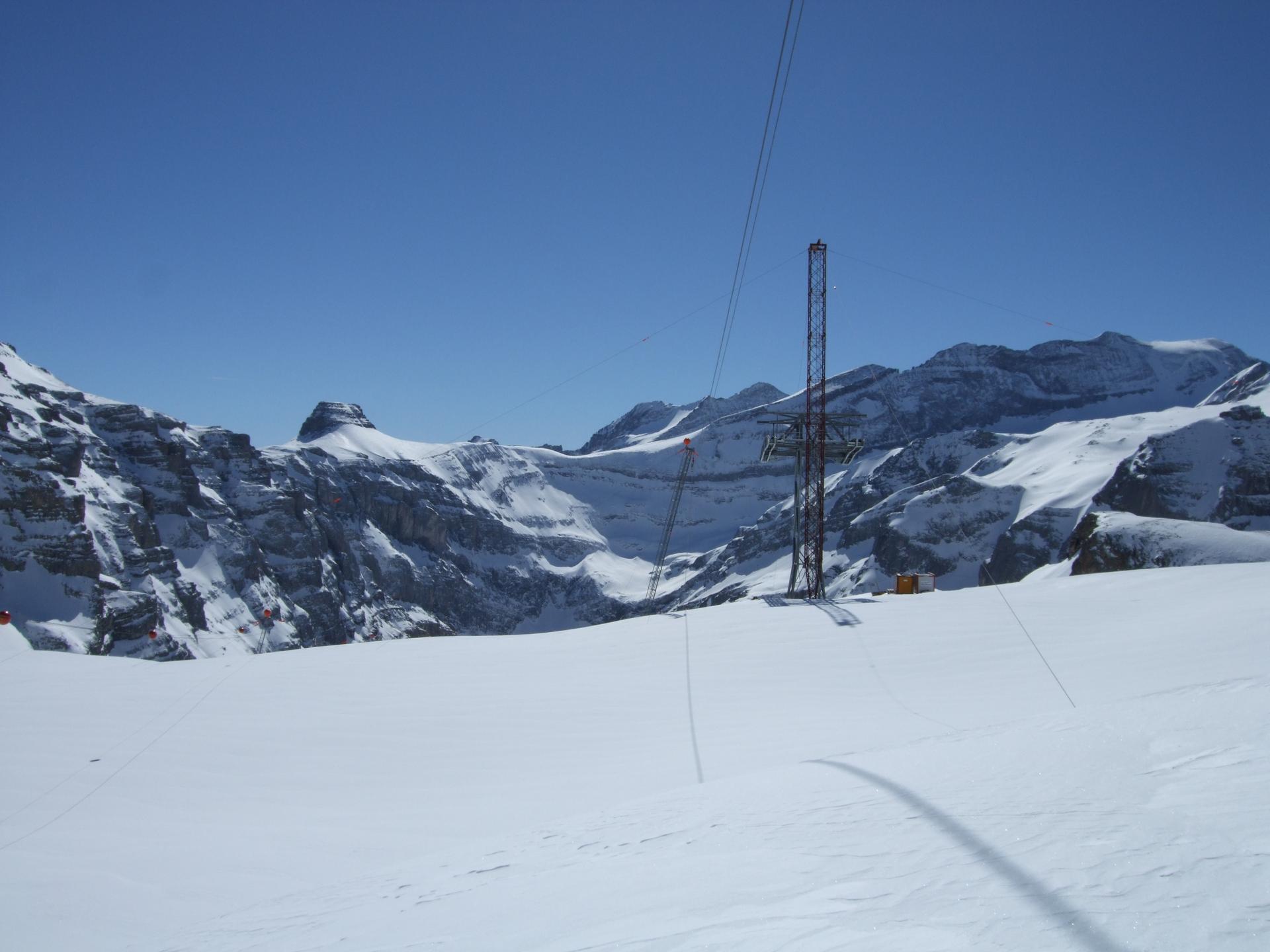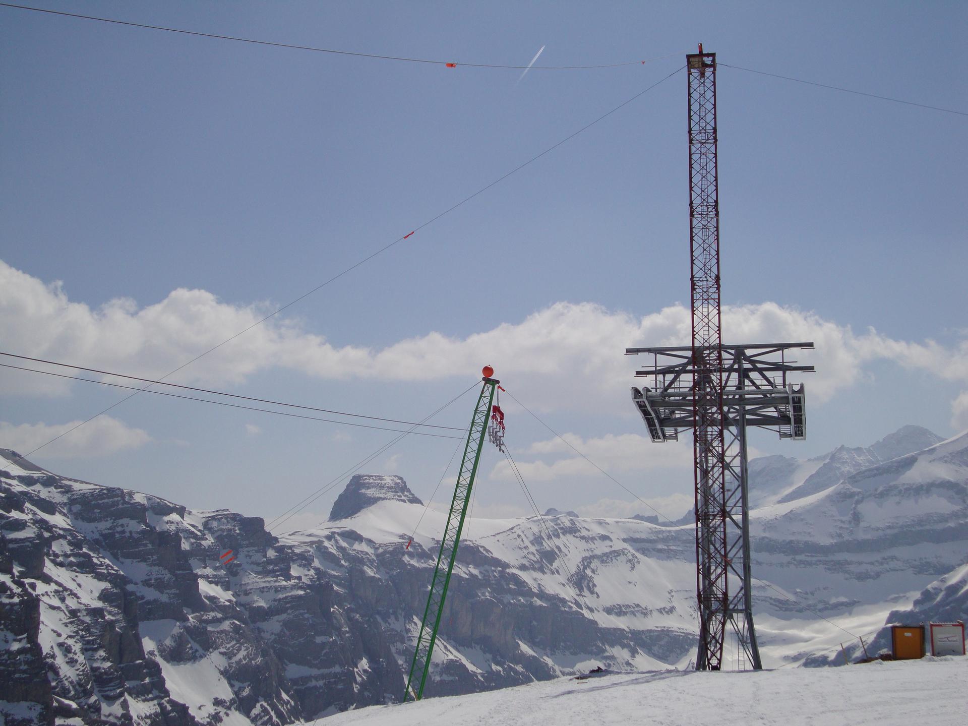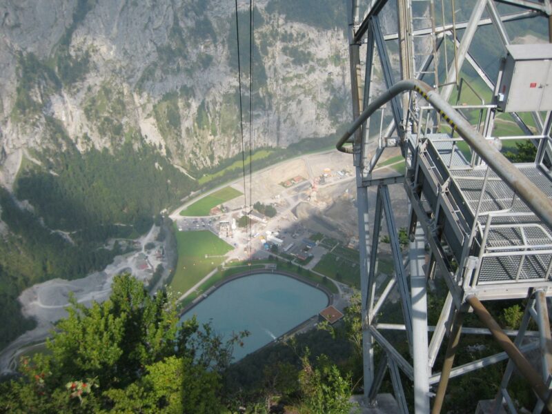 7 to Seilkrananlage im Einsatz beim Bau des Wasserkraftwerks Linthal 2015 in der Schweiz.