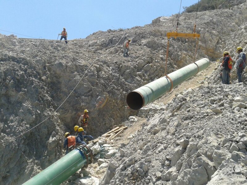 Construcción de gasoducto en un terreno rocoso y escarpado por medio de un sistema de cable-grúa.
