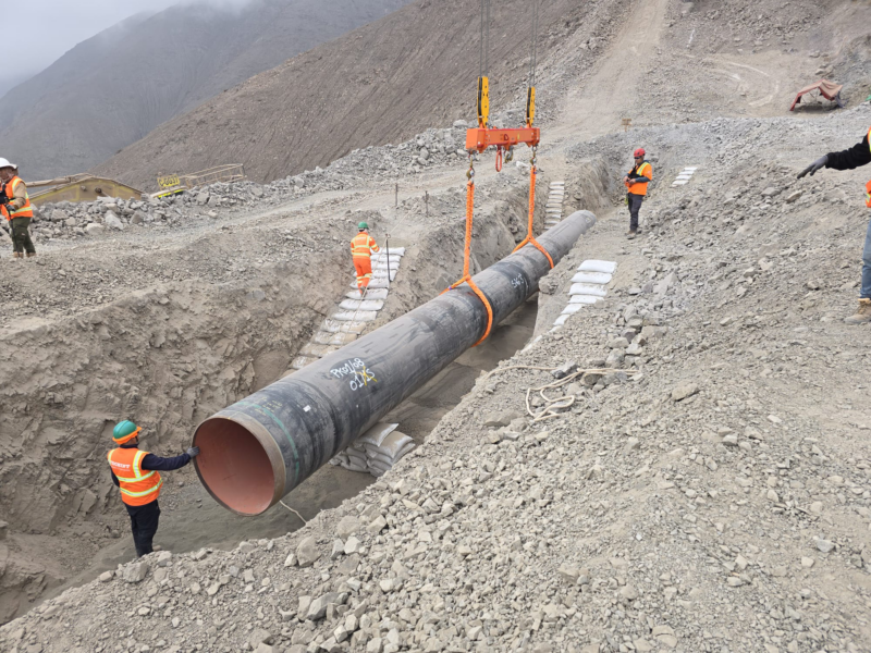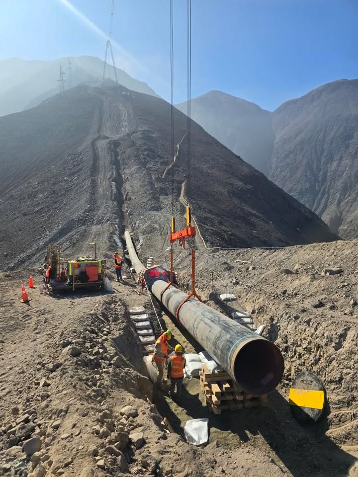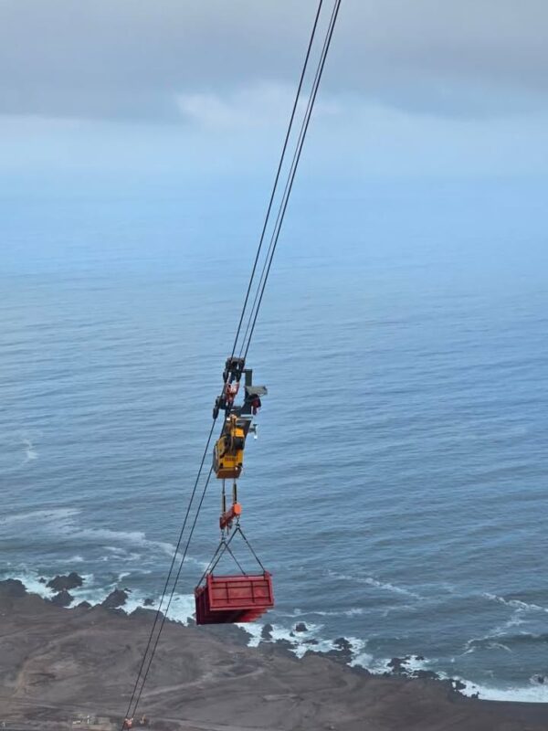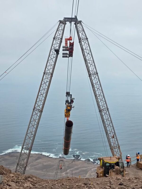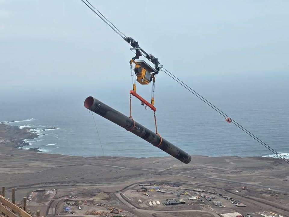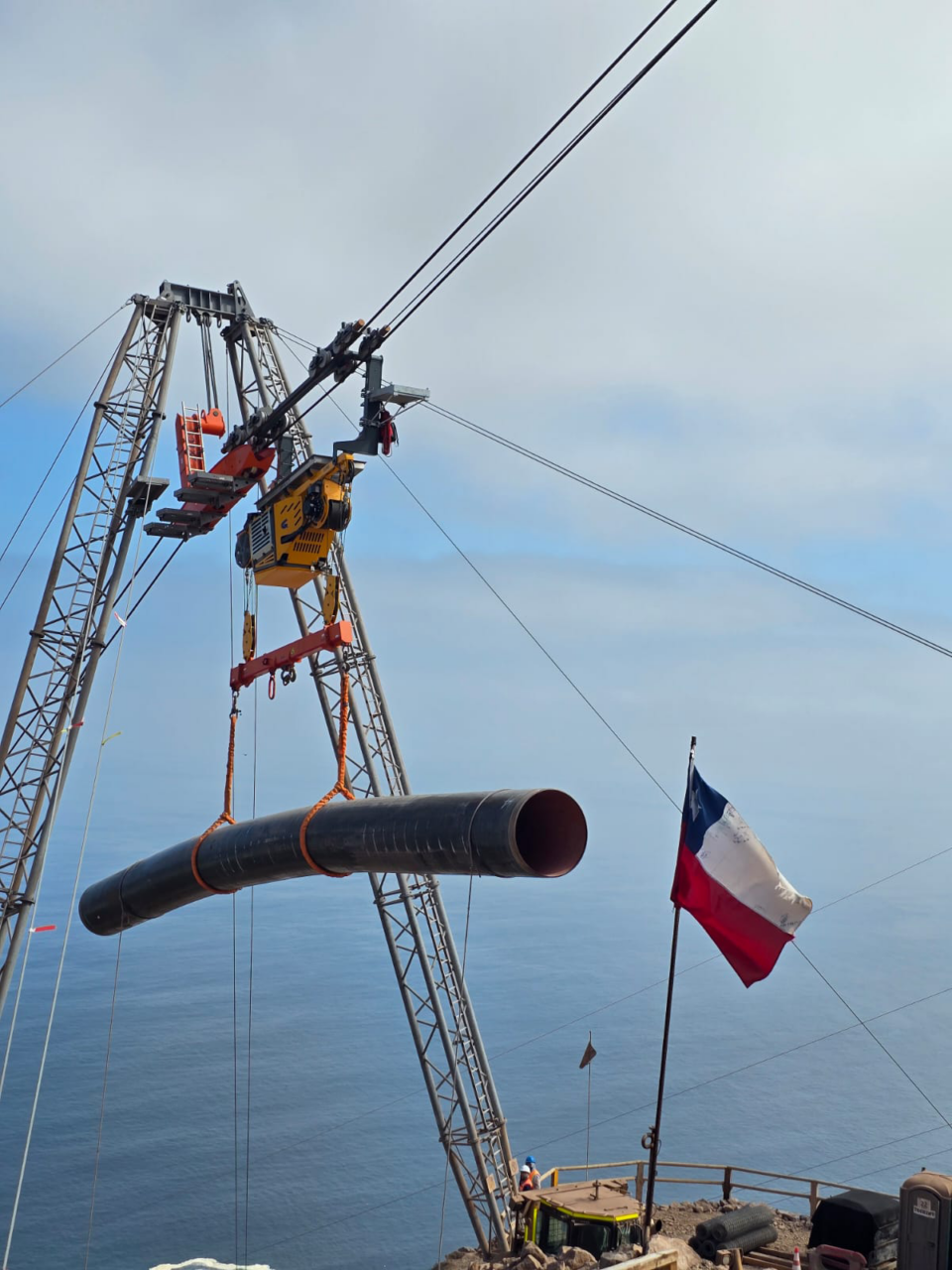 Para abastecer três grandes operações mineiras no norte do Chile com água dessalinizada, é necessária a construção de uma planta dessalinizadora, bem como um sistema de captação e bombeamento de água. A instalação das tubulações necessárias no terreno íngreme e exigente de Tocopilla está sendo realizada com um sistema de teleférico de cargas com curvas da LCS Cable Cranes, com capacidade de carga de 13 toneladas e um comprimento de cerca de 1,6 quilômetros.